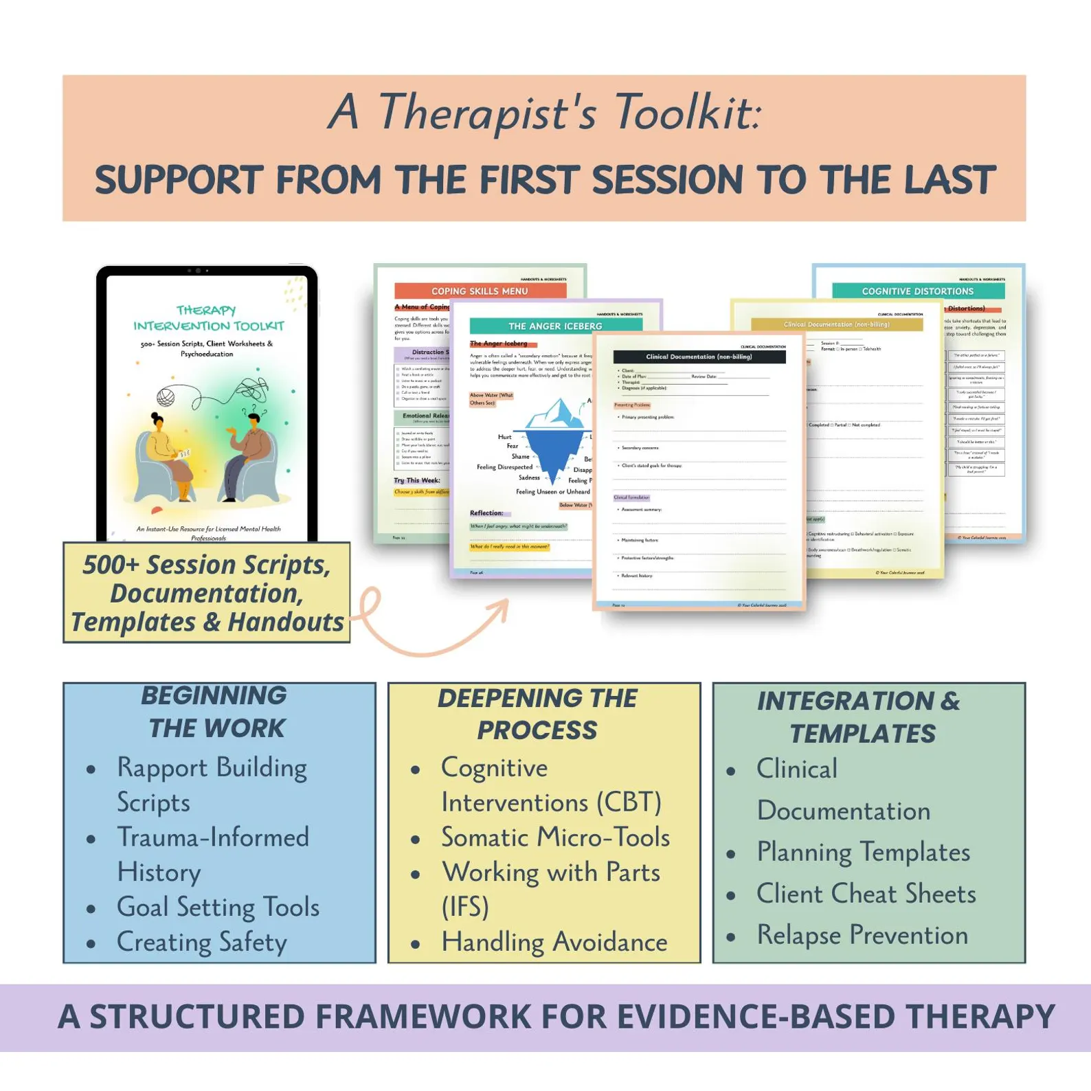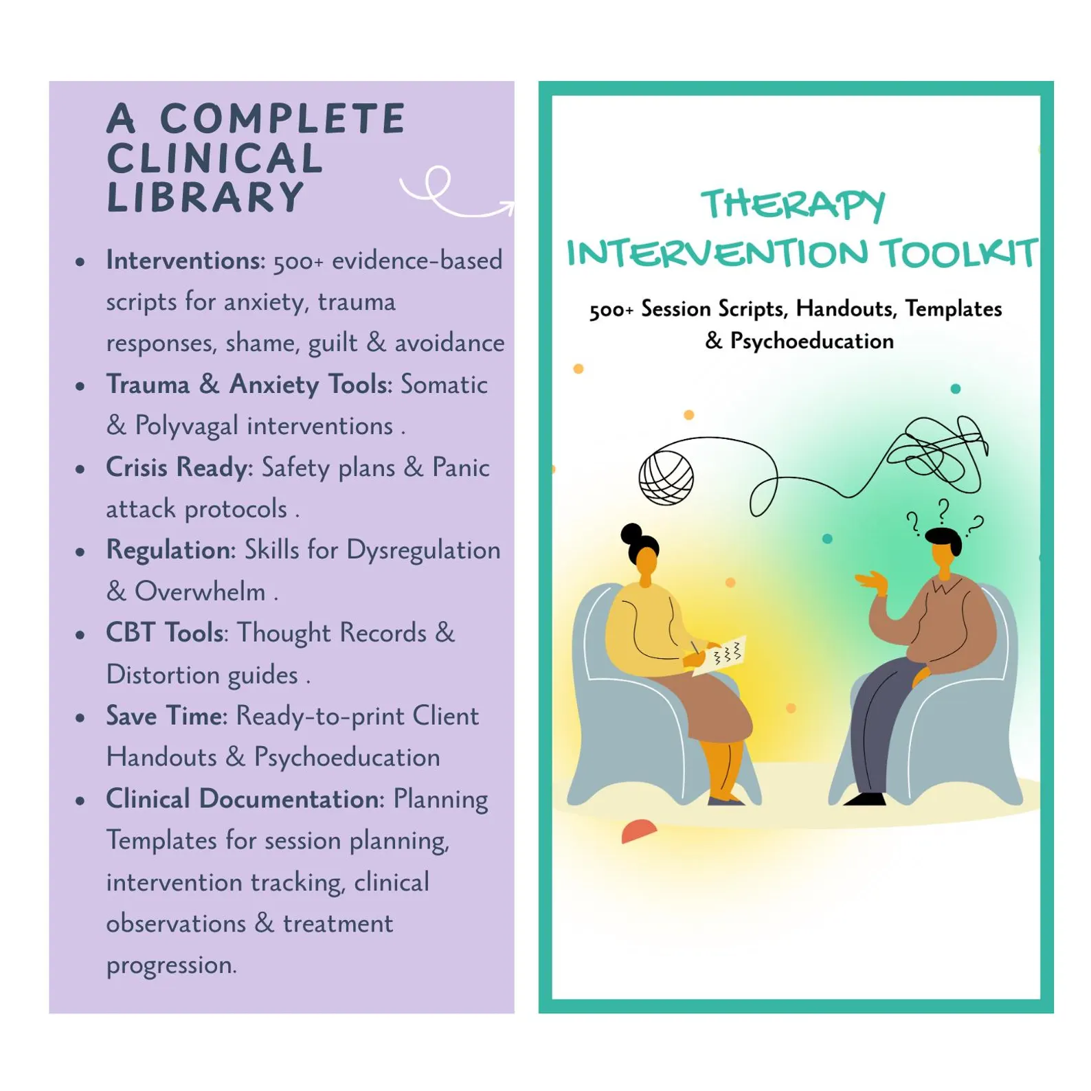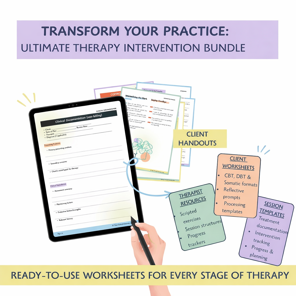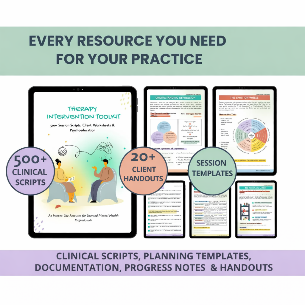 This complete intervention bundle for mental-health professionals provides instant-access language, session scripts, intervention prompts, client handouts, & Psychoeducation to support every stage of therapy. With 500+ phrases and a complete library of worksheets and psychoeducation materials, it is designed to help therapists respond clearly, regulate pacing, and guide clients through complex emotional work.